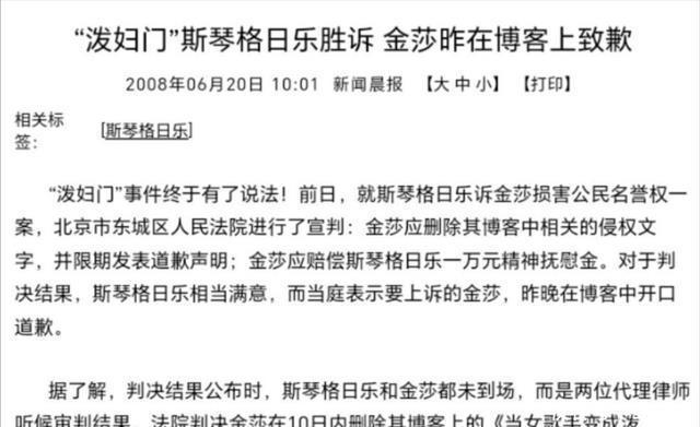 最有争议的就年的“泼妇门”官司,当时金莎在博客发文称斯琴格日乐说粗口,被对方以诽谤告上法庭,最终法院一审判决金莎败诉,斯琴格日乐获万元。 这是有明确司法判决的事实,金莎后来也坦然承认是年少轻狂,算是成长里的代价。